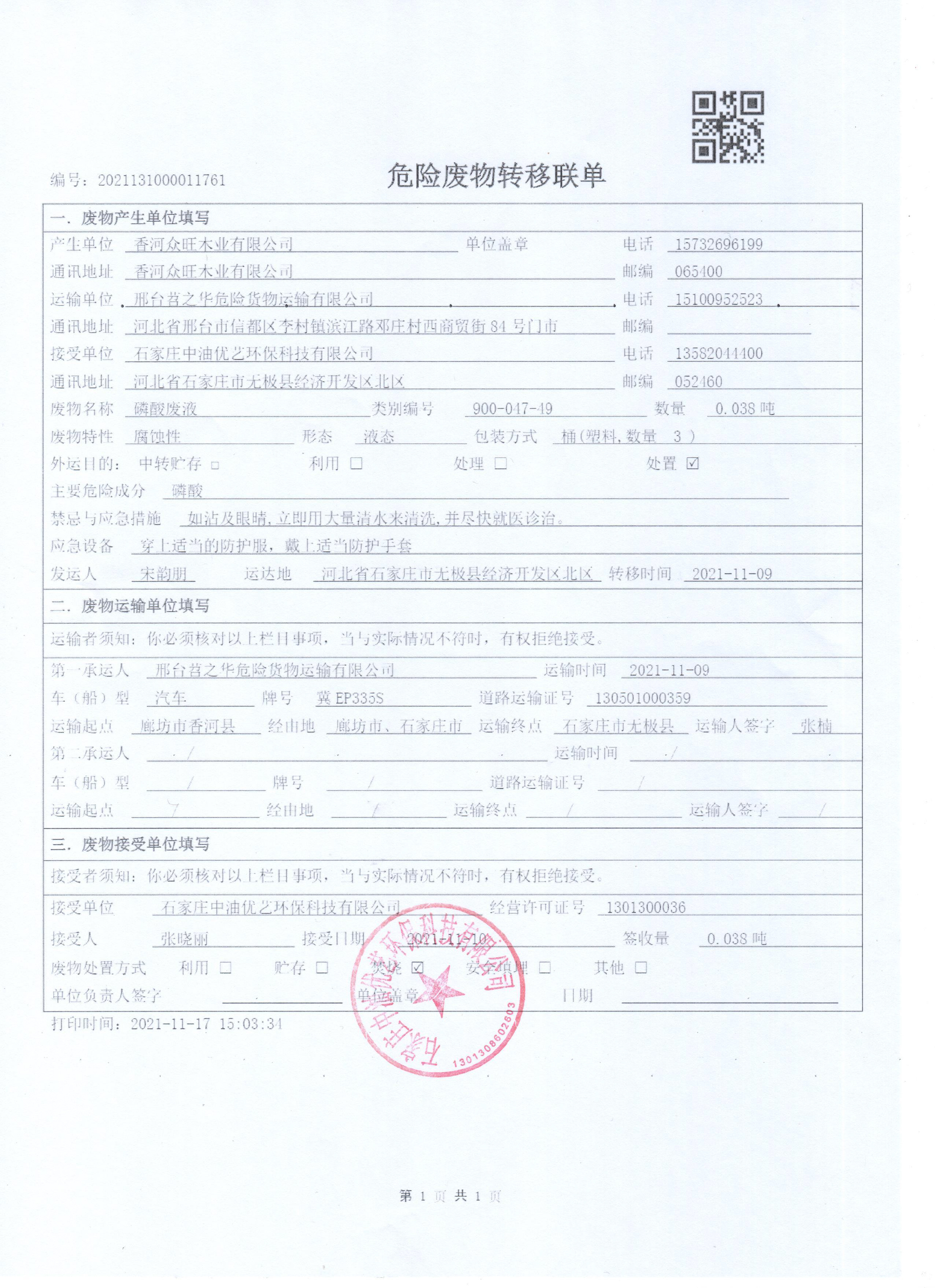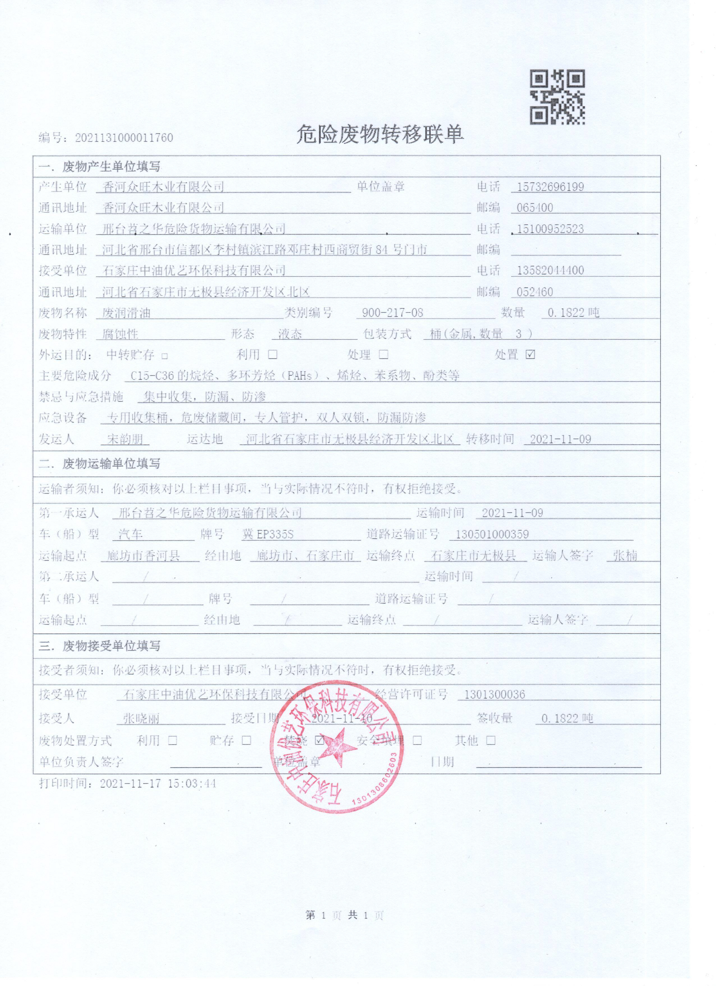 香河眾旺木業(yè)有限公司2021年危險(xiǎn)廢物管理情況